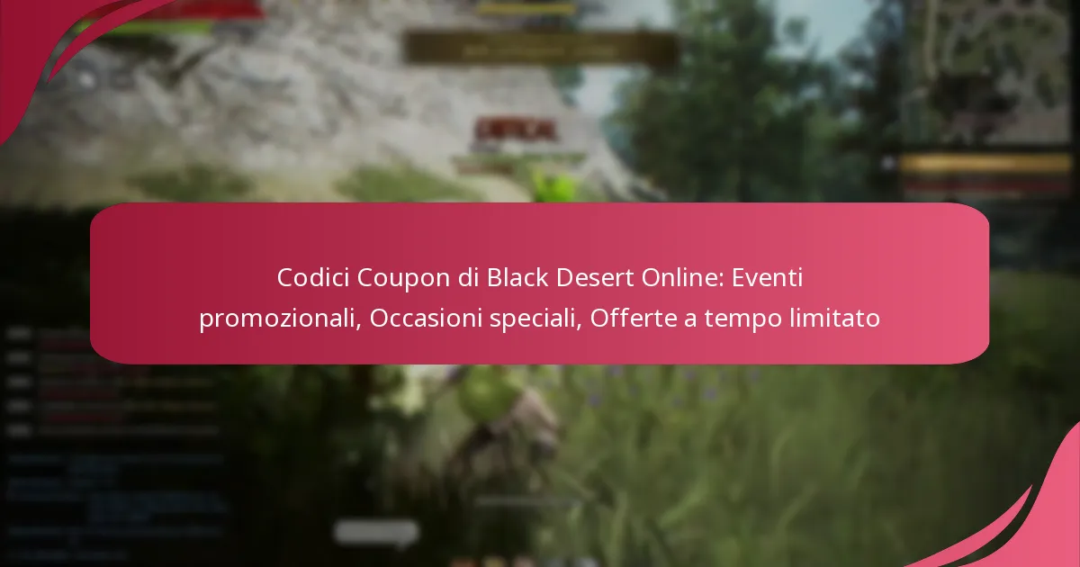 Gli eventi stagionali in Black Desert Online presentano spesso codici coupon speciali che forniscono ricompense o sconti unici. Questi eventi coincidono tipicamente con festività importanti o traguardi del gioco, offrendo ai giocatori l’opportunità di acquisire articoli o bonus esclusivi. Partecipare a questi eventi può migliorare significativamente l’esperienza di gioco e fornire risparmi sostanziali.