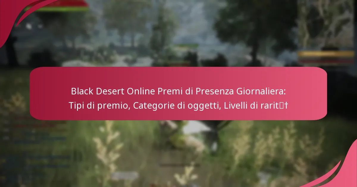 Le ricompense per la presenza giornaliera in Black Desert Online consistono in diverse categorie di oggetti che migliorano il gameplay e forniscono risorse preziose. I giocatori possono aspettarsi di ricevere oggetti che vanno dall’equipaggiamento e consumabili a materiali per il crafting e cosmetici, ciascuno con livelli di rarità variabili. Comprendere queste categorie può aiutare i giocatori a pianificare la loro presenza per massimizzare i benefici.